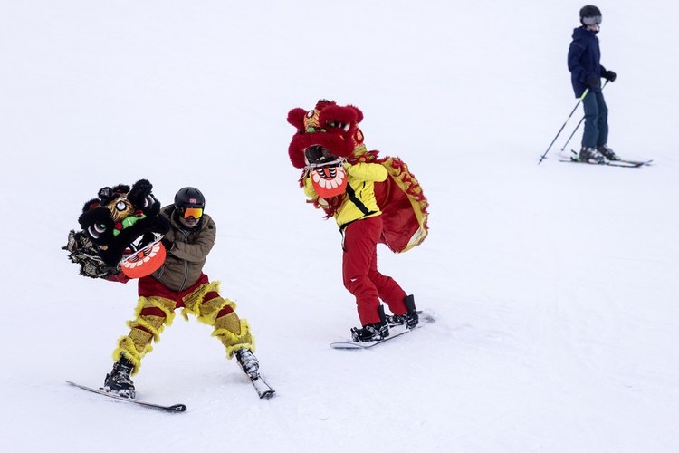 After taking off the costume, watchers around recognized that it was two Chinese skiers who staged the show. Skiers gathered around and asked if they could take pictures with them and share the joy of the Chinese New Year.