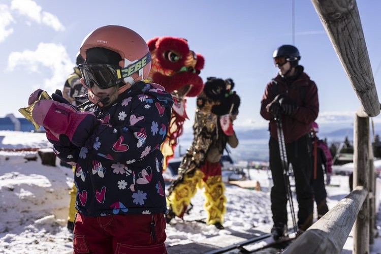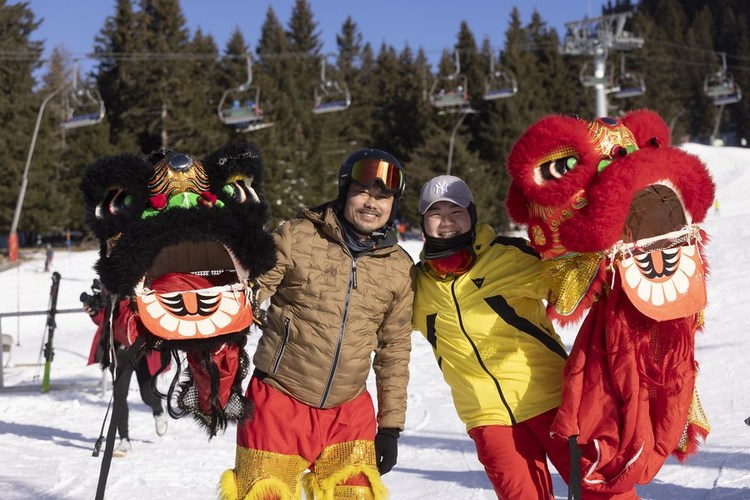 To celebrate the coming Chinese Spring Festival and share the Chinese New Year blessings, the “lion dance” team also distributed lucky bags containing cookies to the children queuing at the ski conveyor belt.